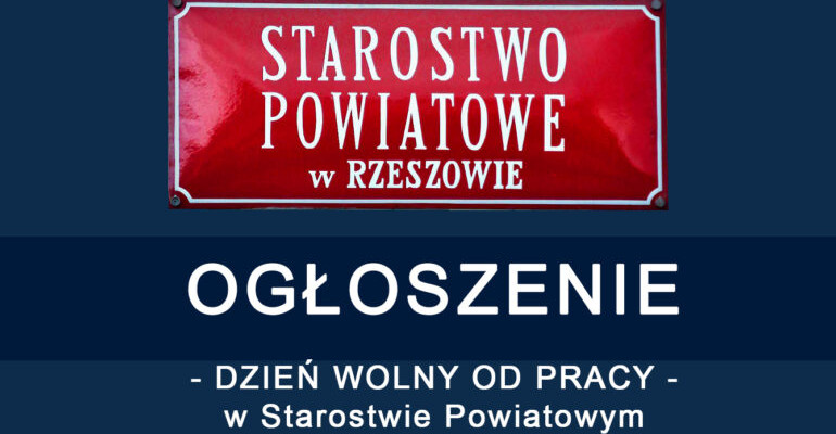 Uprzejmie informujemy, że Zarządzeniem nr I/29/2025 Starosty Rzeszowskiego z dnia 10.10.2025 r. dzień 10 listopada 2025 roku (poniedziałek) ustalono dniem wolnym od pracy w Starostwie Powiatowym w Rzeszowie, w związku z przypadającym w sobotę 1 listopada 2025 r. dniem wolnym od pracy – Wszystkich Świętych.