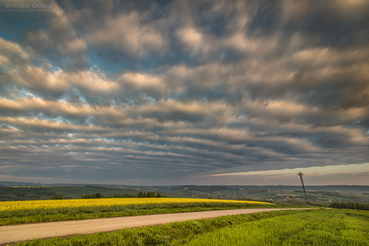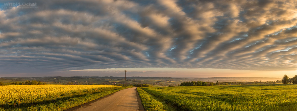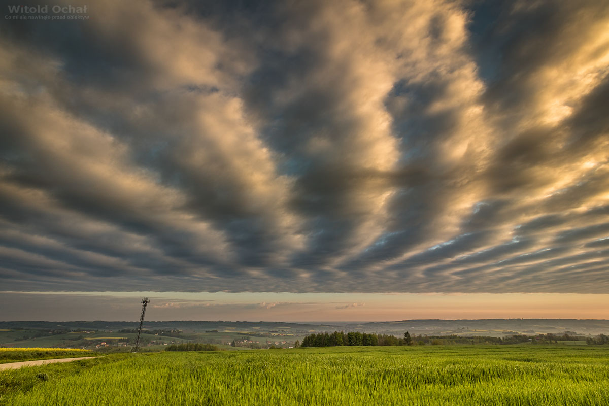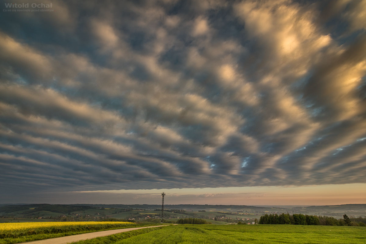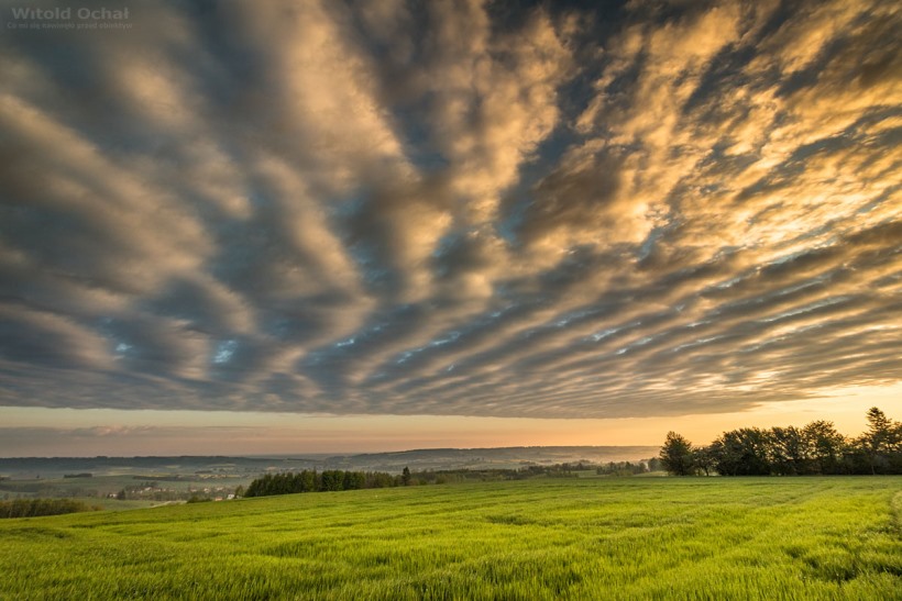 – Jest 5:45. Wyjeżdżam na jeden z wyższych wzniesień w mojej okolicy. Słońce wstało kilkadziesiąt minut temu. Nad zachodnią stroną horyzontu rozpościerają się okazałe pasiaste chmury podświetlone od dołu słońcem. To książkowy przykład chmur altocumulus stratiformis undulatus. Piękniejszego poranka nie mogłem sobie wymarzyć. – pisze na swoim blogu autor zdjęć.